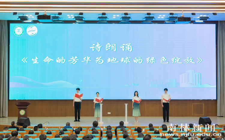 会上,学生代表带来节目诗朗诵《生命的芳华为地球的绿色绽放》。慷慨激昂的青春之音号召广大青年携手共进,勇担重任,不负芳华,以坚定的步伐,穿越四季的轮回,丈量着从荒芜到葱郁的距离,以热血青春,铸就美丽中国的坚实基石。